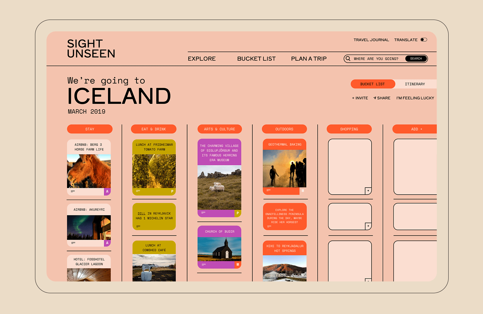 Before I started this whole process, I wanted to put into practice how my friends and I could have planned our first Iceland trip. Instead of dumping every sight and link in a Google Doc, what if we tried a Kanban method. This type of drag and drop sorting would allow you to take your bucket list and flip it into your itinerary, allowing your thoughts to flow and flex in an organized way. For a future iteration of this idea, I would love to explore saving multiple itinerary versions to see what arrangement your group likes best.